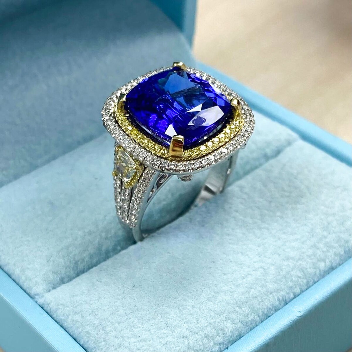 GIA 8.68 Ct Violeta Azul Tanzanita Anillo de compromiso de diamantes 14K oro 10.34 TCW