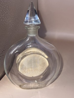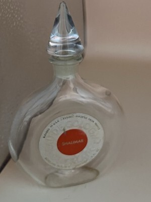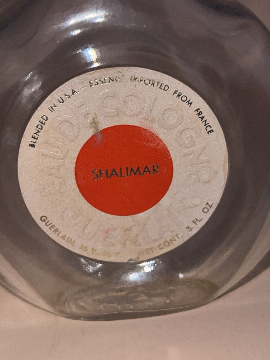 Vintage Guerlain Shalimar Eau de Cologne bottle, 3 fl oz size, empty. Features the elegant clear glass design with the faceted crystal-style stopper and original round label reading ?Blended in U.S.A. ? Essence Imported from France.? The bottle shows light residue and normal age wear but remains clean and displays beautifully. Perfect for collectors of vintage Guerlain, vanity decor, or bottle repurposing.
