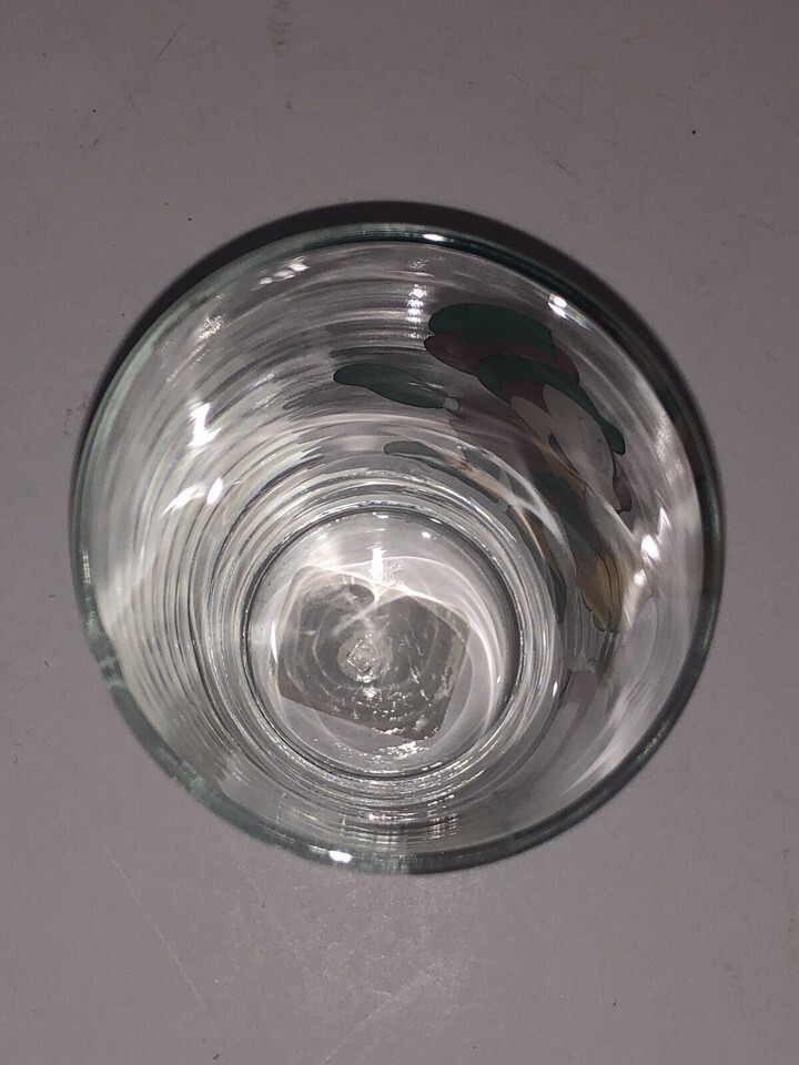 The product is a vintage Disney Mickey Mouse snowman juice glass made by Anchor Hocking. Standing at 4.5" tall and 3.5" wide, this collectible item features the iconic Mickey Mouse character from the Disney franchise. Perfect for fans of Disney and collectibles, this glass combines nostalgia with a festive snowman design, making it a charming addition to any Disneyana collection.