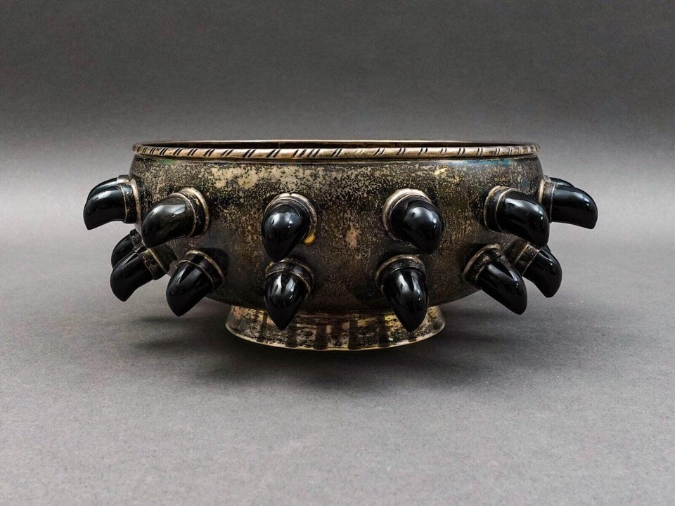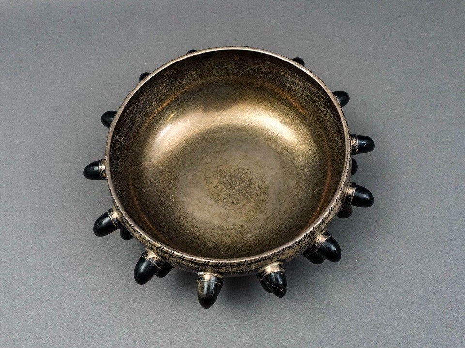 Tane Mexico Mid Century Modern Sterling Silver Carved Obsidian Centerpiece Bowl