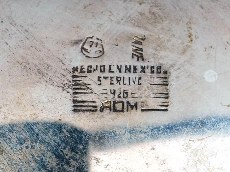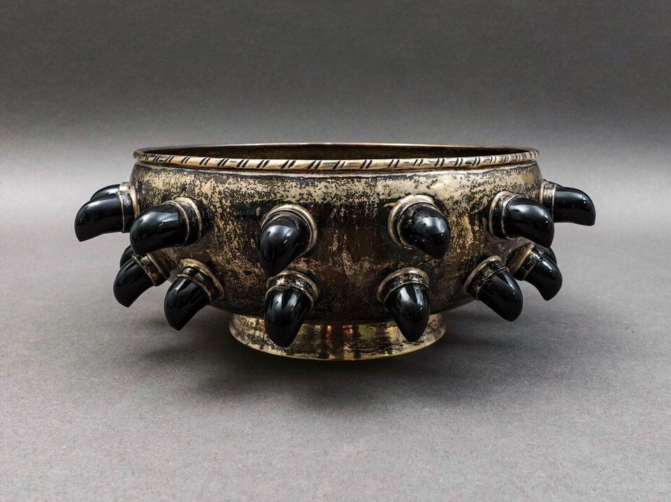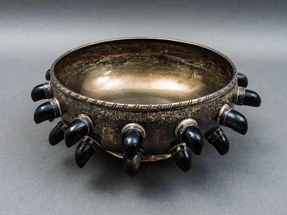 Tane Mexico Mid Century Modern Sterling Silver Carved Obsidian Centerpiece Bowl.