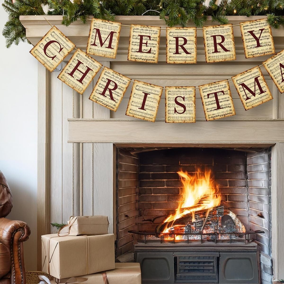A set of vintage hymns carols Christmas garland. Each card of the banner is printed with lyrics and rhythms from Christmas carols and letters consisting of the Xmas sign "MERRY CHRISTMAS". The farmhouse retro design adds a classic and nostalgic touch to your Christmas decorations.