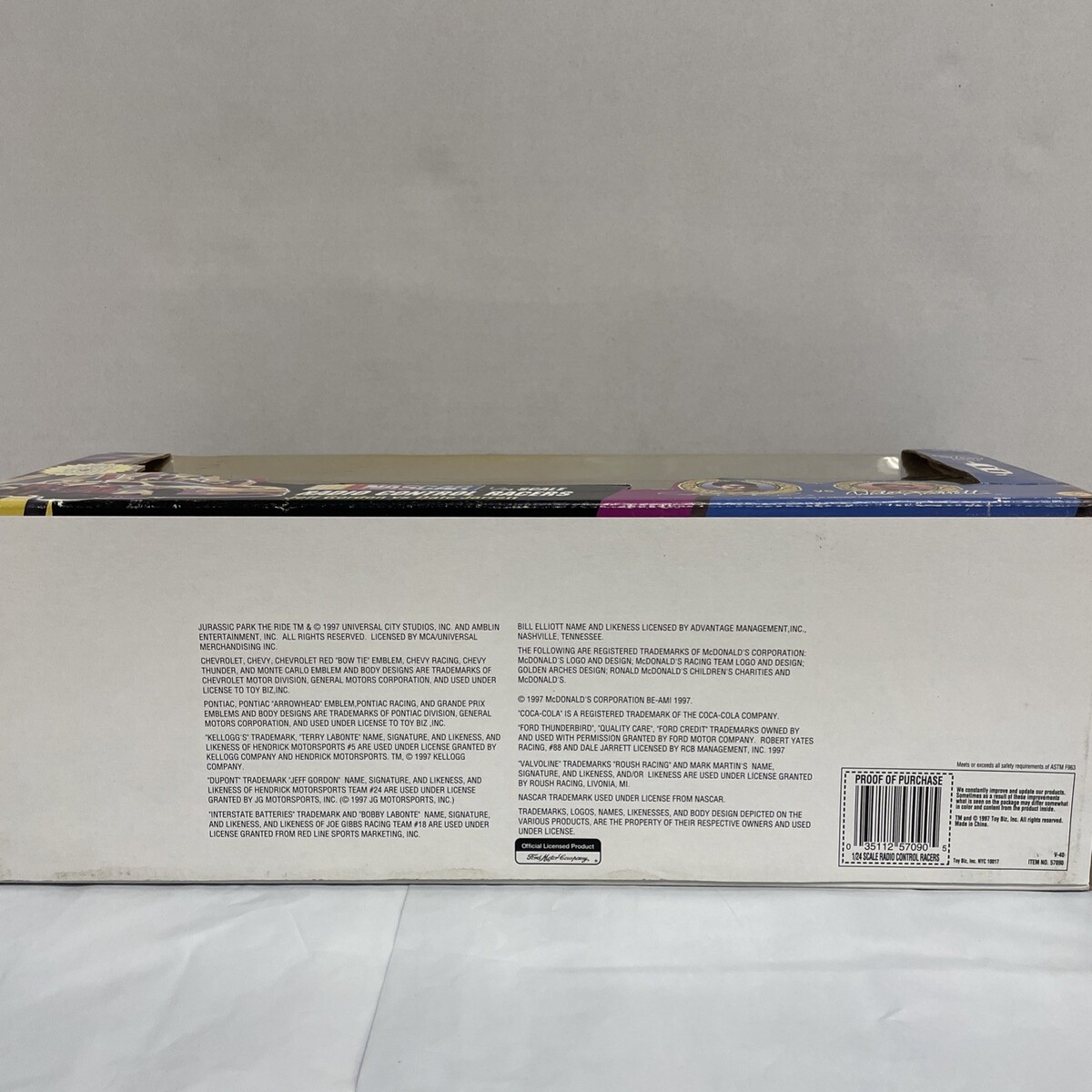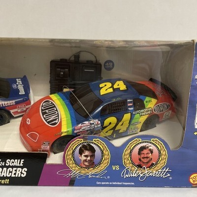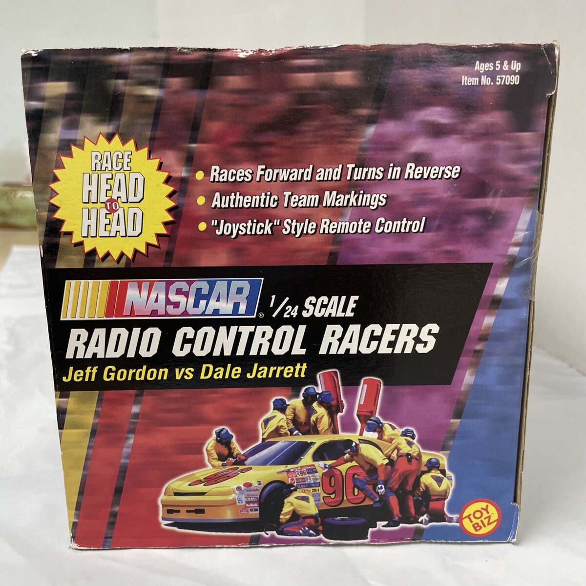 This product is a 97 NASCAR Car 2pcs Jeff Gordon #24 Dale Jarrett #88 1/24 Scale Radio Control set made by Toy Biz. The diecast cars feature Jeff Gordon's Chevrolet Impala and Dale Jarrett's Ford Thunderbird, both from the 1997 racing season. The multi-color cars come in an unopened box and are part of the Nascar series, perfect for any racing enthusiast or collector. With remote control and a scale of 1:24, these models capture the essence of the sport of NASCAR and the iconic drivers Jeff Gordon and Dale Jarrett.