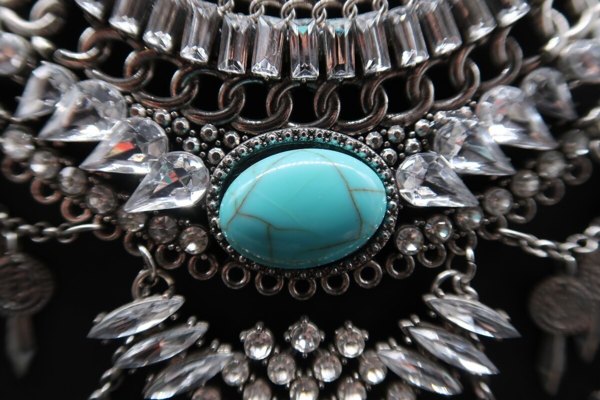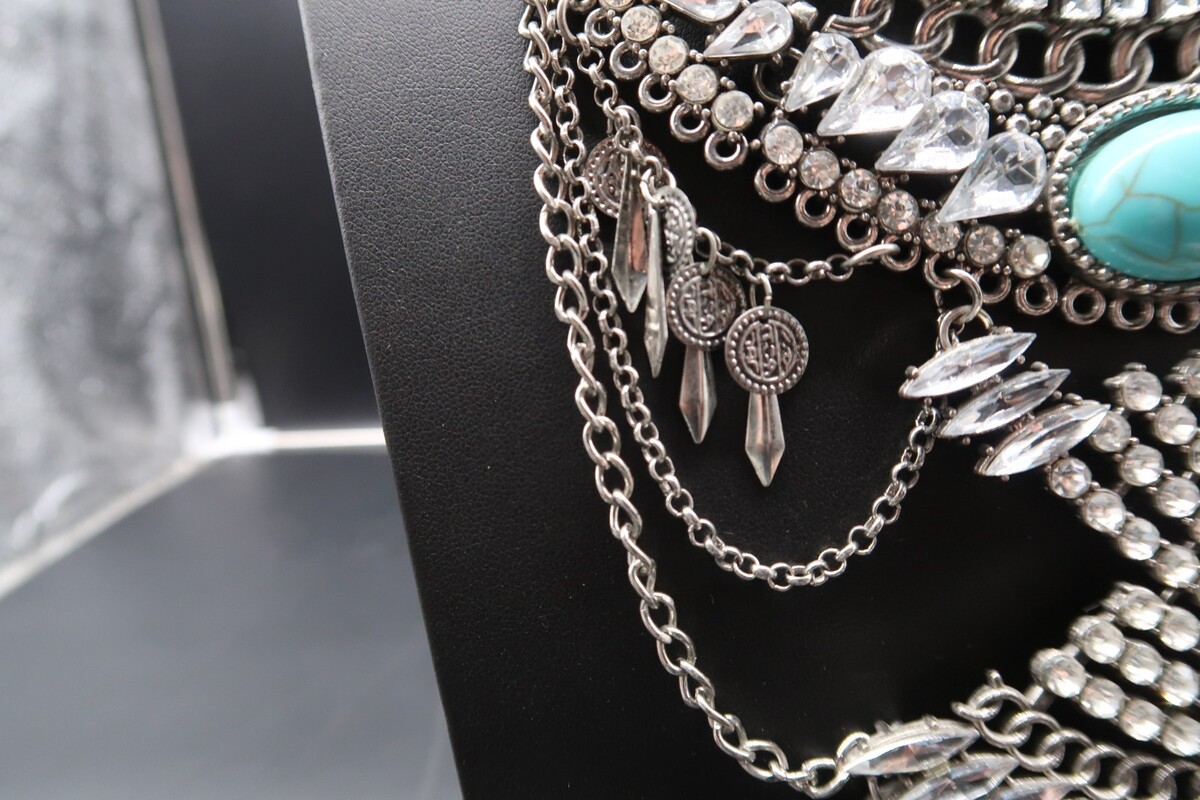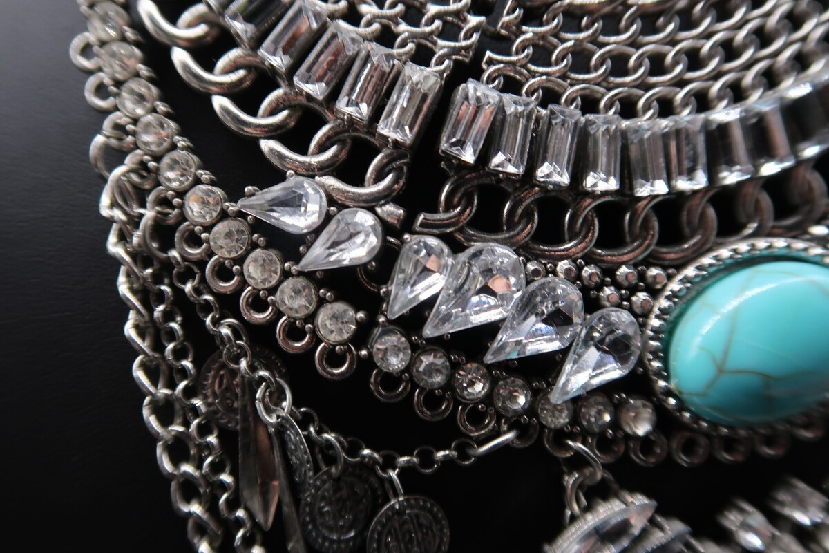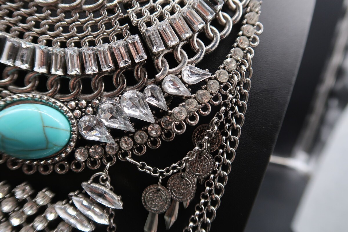 Vtg Princess Choker Bib Necklace Faux Turquoise Cabochon Rhinestone Studded