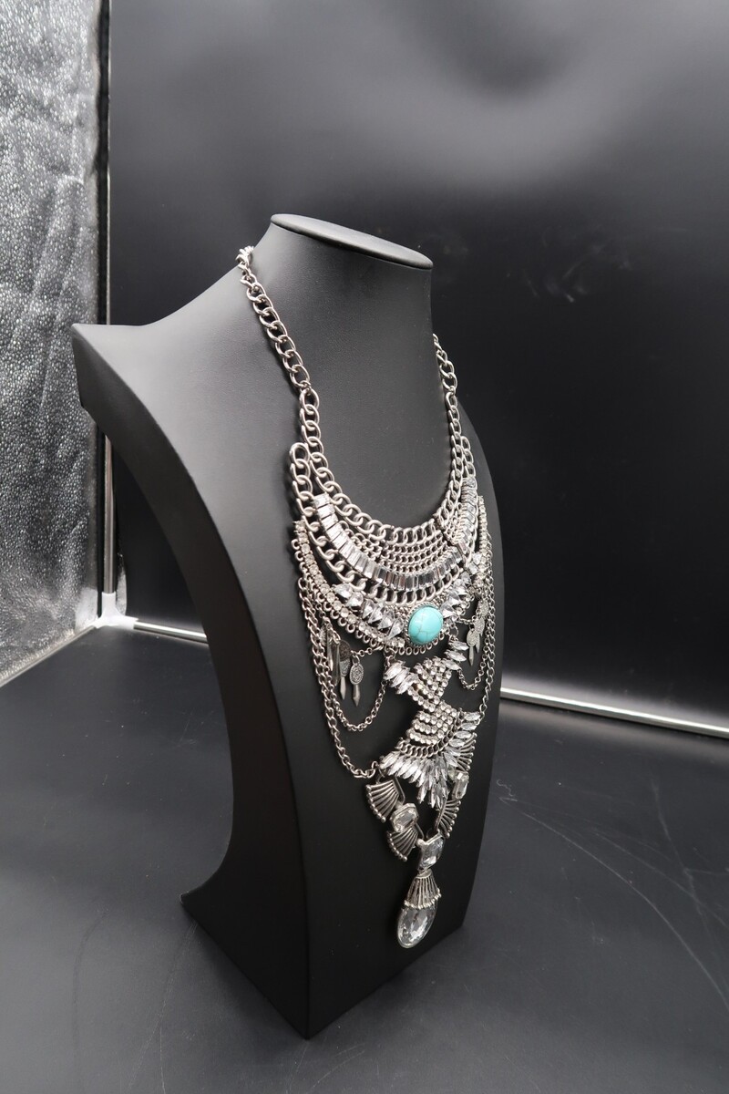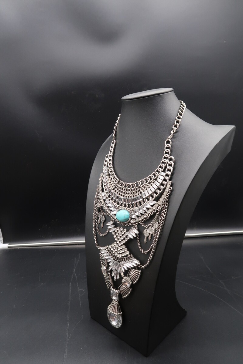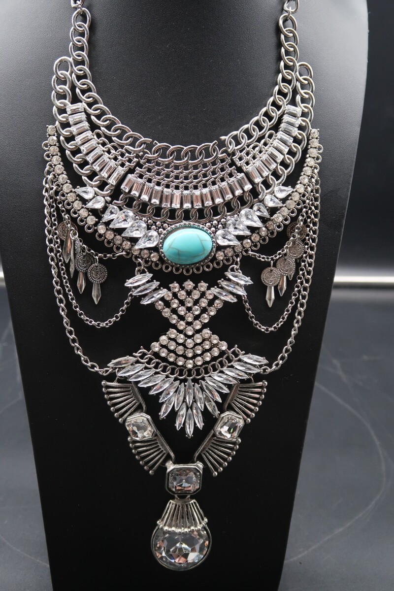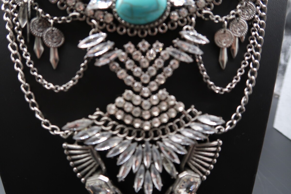 Vtg Princess Choker Bib Necklace Faux Turquoise Cabochon Rhinestone Studded