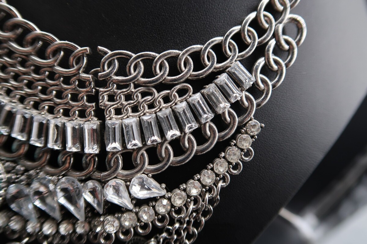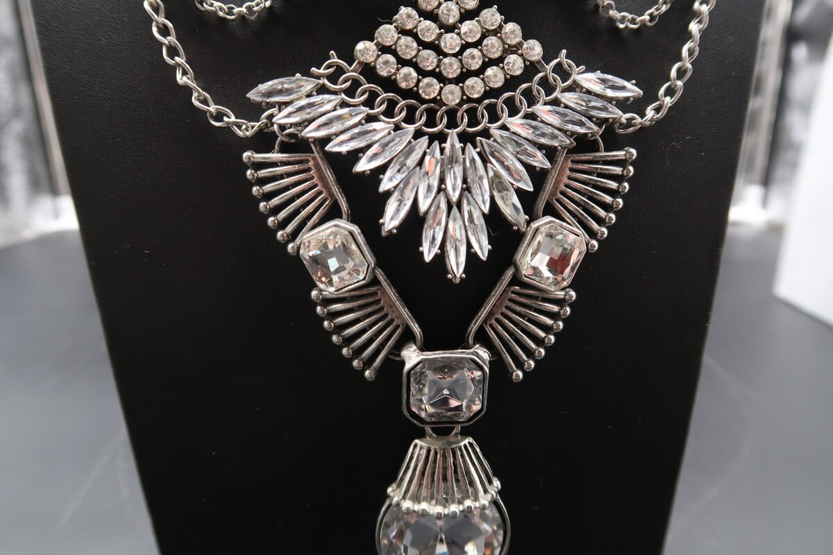 This one is stunning, I looked it over and didn't find any missing stones but there are A LOT of stones, baguette, marquise, round, all faceted, it's possible I may have missed one, but the necklace is wonderful in either event. Everyone will notice this necklace at your event. Please carefully examine all pictures before purchasing. The pictures are an important part of the description, and usually include important measurements. Items are in good pre-owned condition unless otherwise noted.