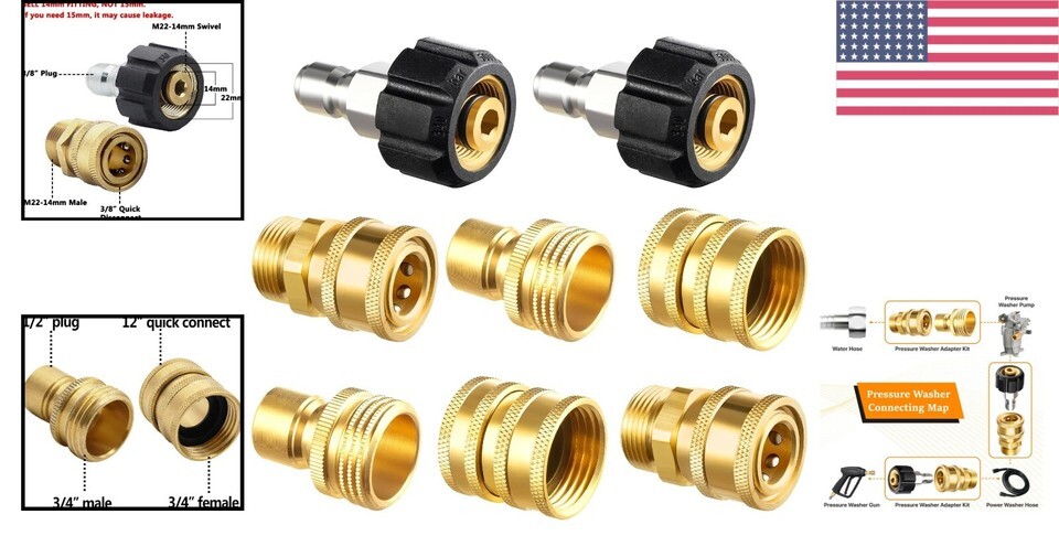 Items Included: M22-14 swivel,3/8,M22-14 male,3/4,1/2,2 pack 3/8" QD + M22-14 male,2 pack 1/2" plug+ 3/4" male