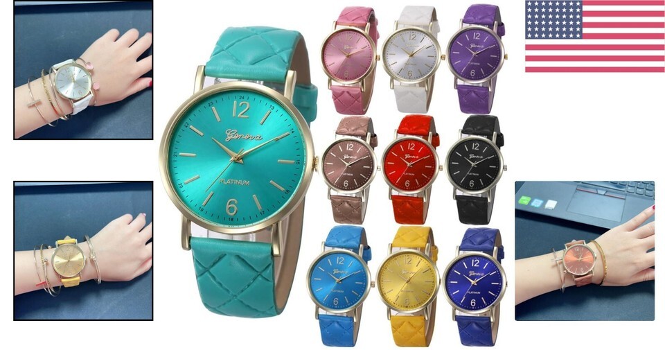 10 elegant watches available in a harmonious palette: black, white, pink, red, brown, blue, green, yellow.