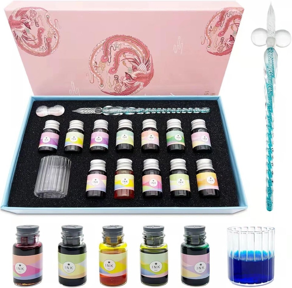 Luxury Glass Dip Pen Set with 12 Non-Toxic Inks