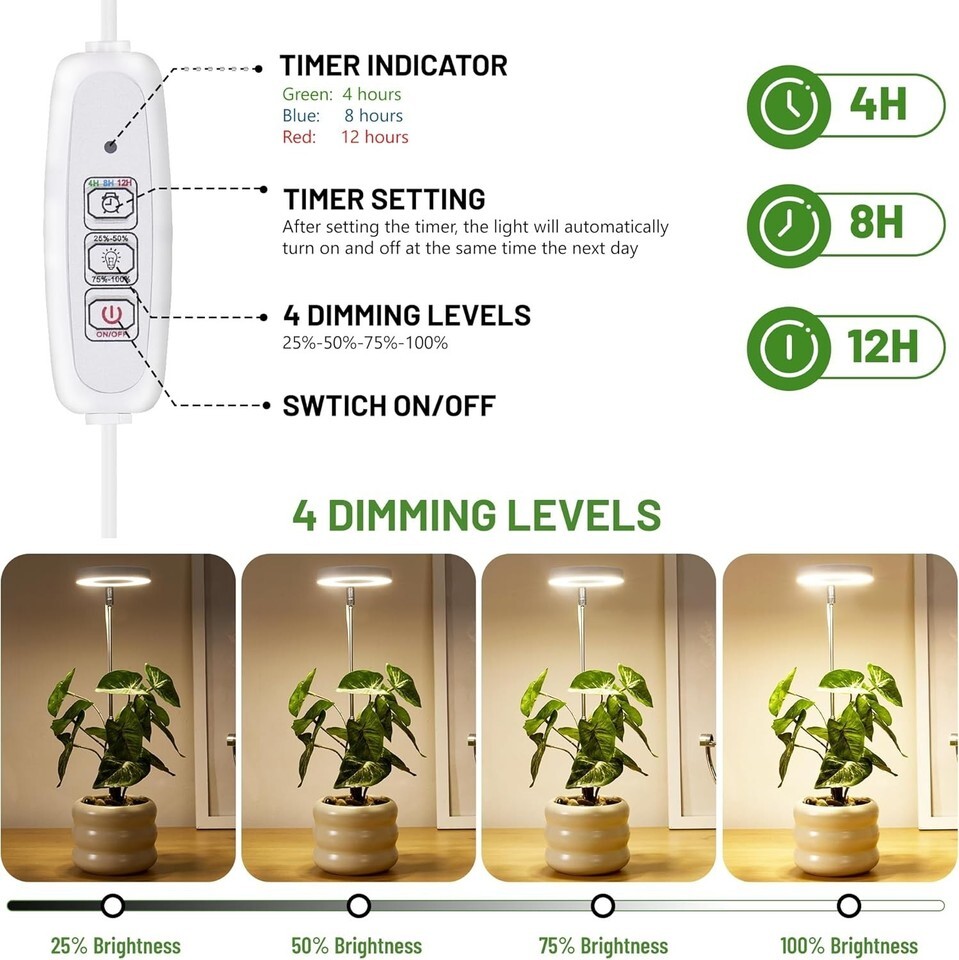 Four Adjustable Brightness Levels: Customize the light intensity (25%-50%-75%-100%), providing tailored care without the risk of overheating your plants.