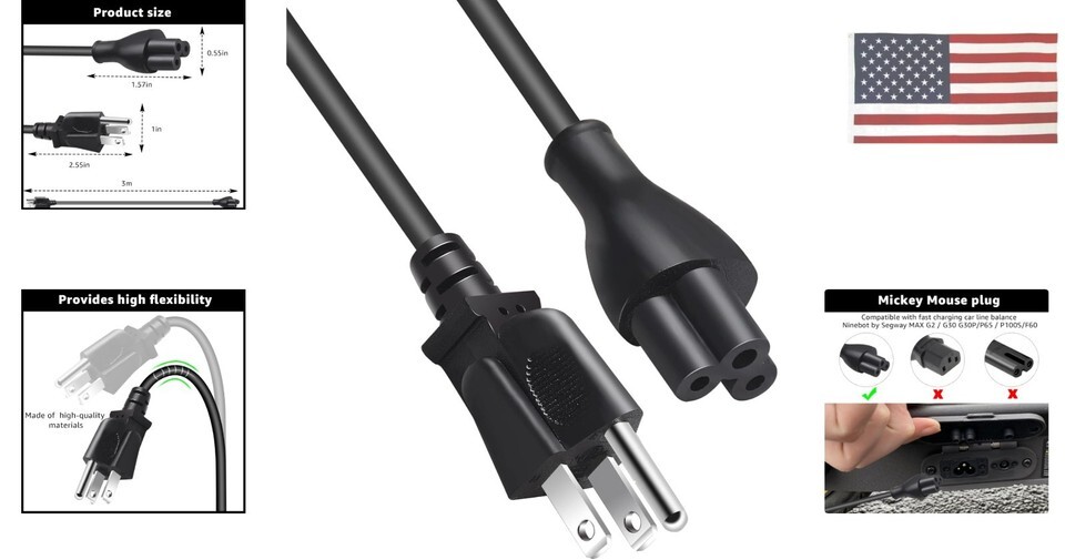 10FT Fast Charging Cable Compatible with Segway Ninebot MAX G2/G30/G30P/P65/P100S/F60, 3-Prong AC Power Replacement Cord (Not for G30LP)