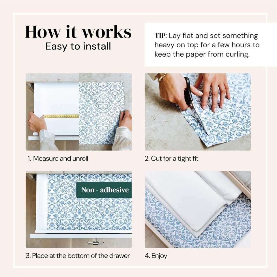 Each package includes six non-adhesive sheets measuring 14" x 19.6" that can be easily cut to fit any drawer or cabinet.
