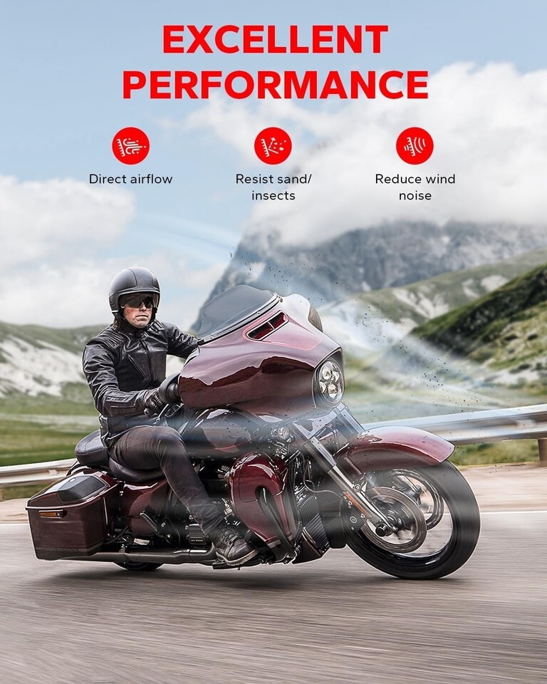 Noise Reduction: Experience reduced wind noise, allowing you to fully enjoy your motorcycle sound system.