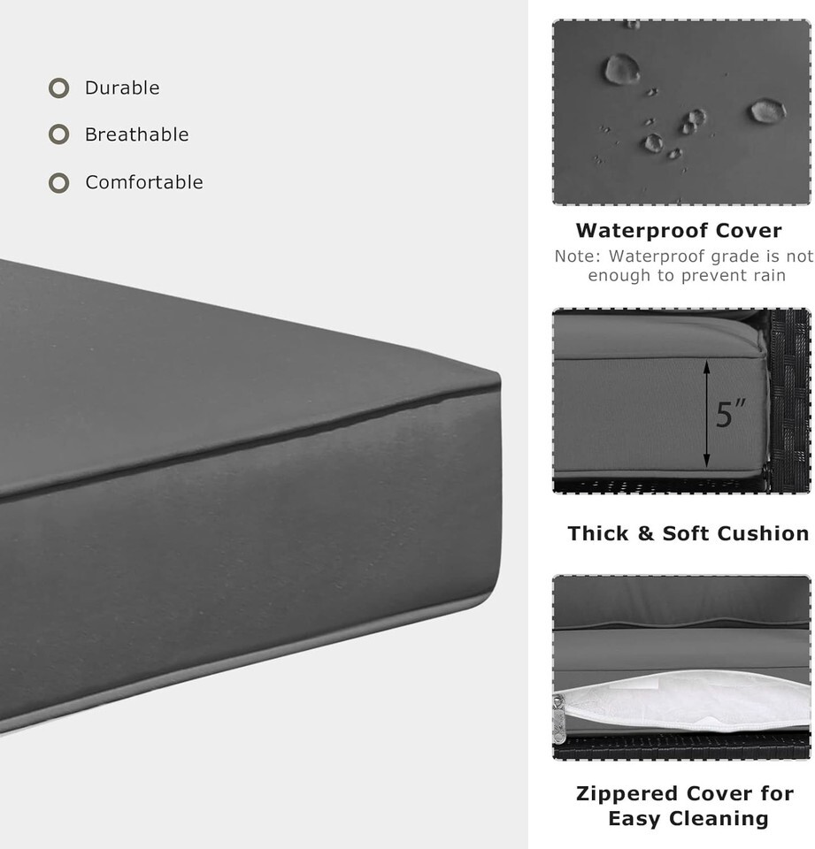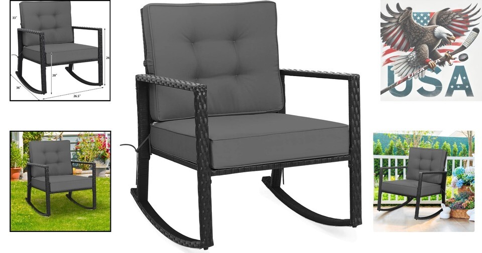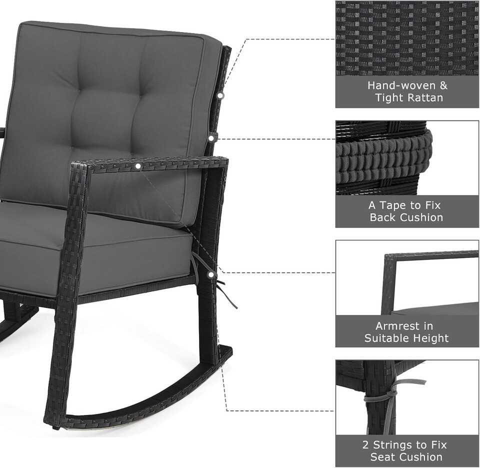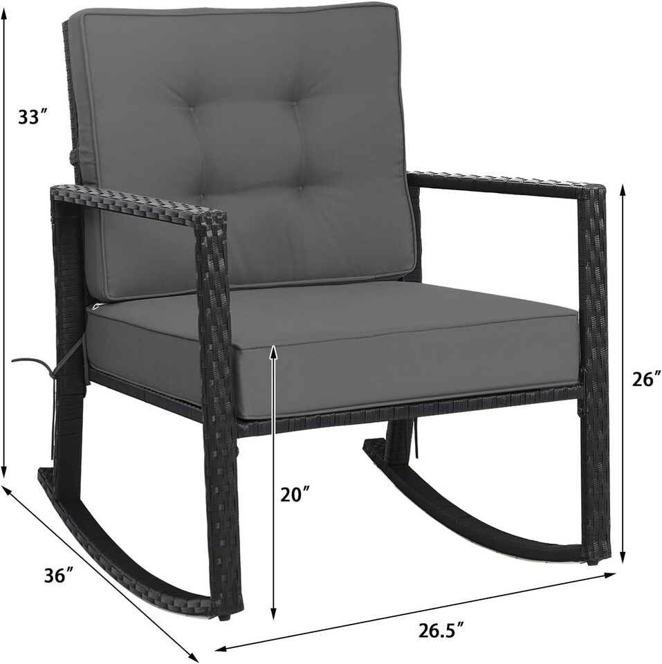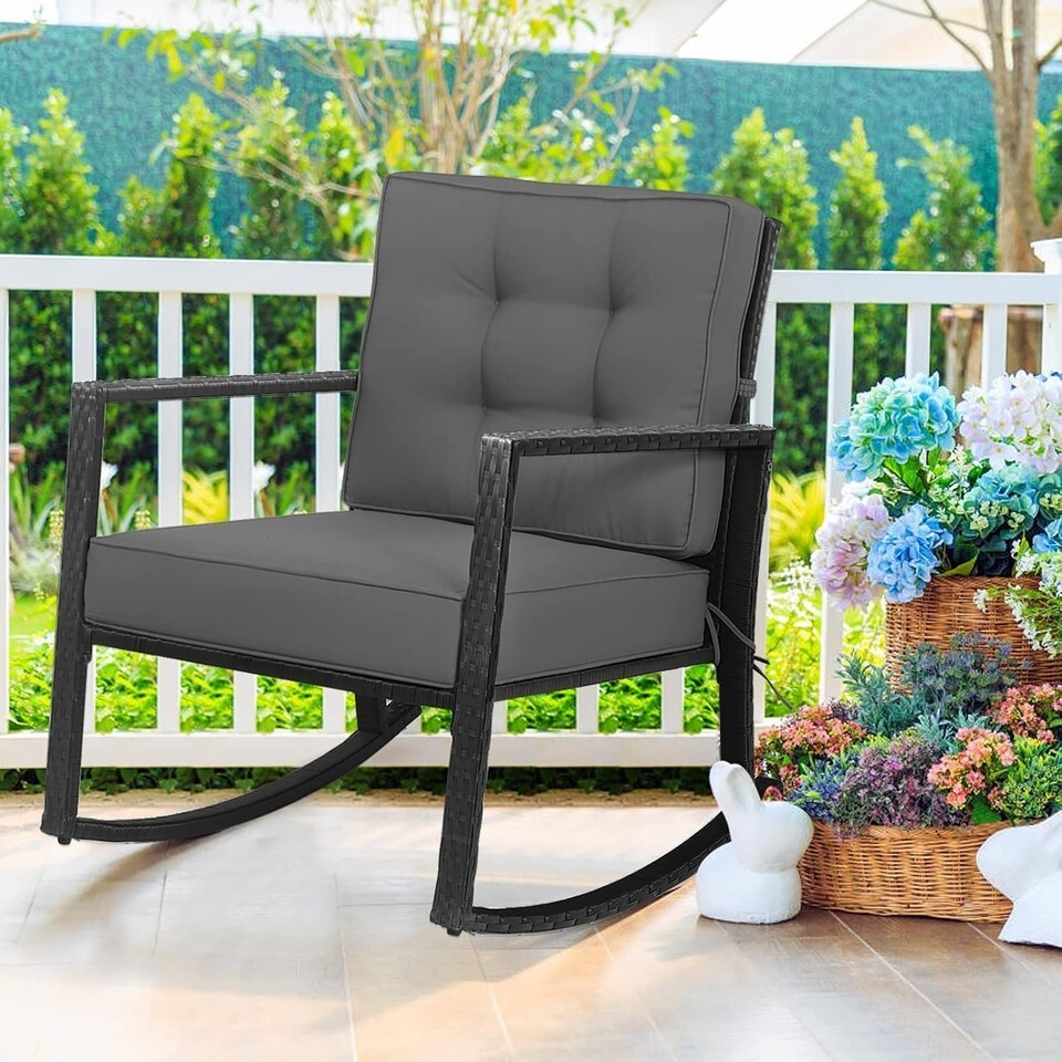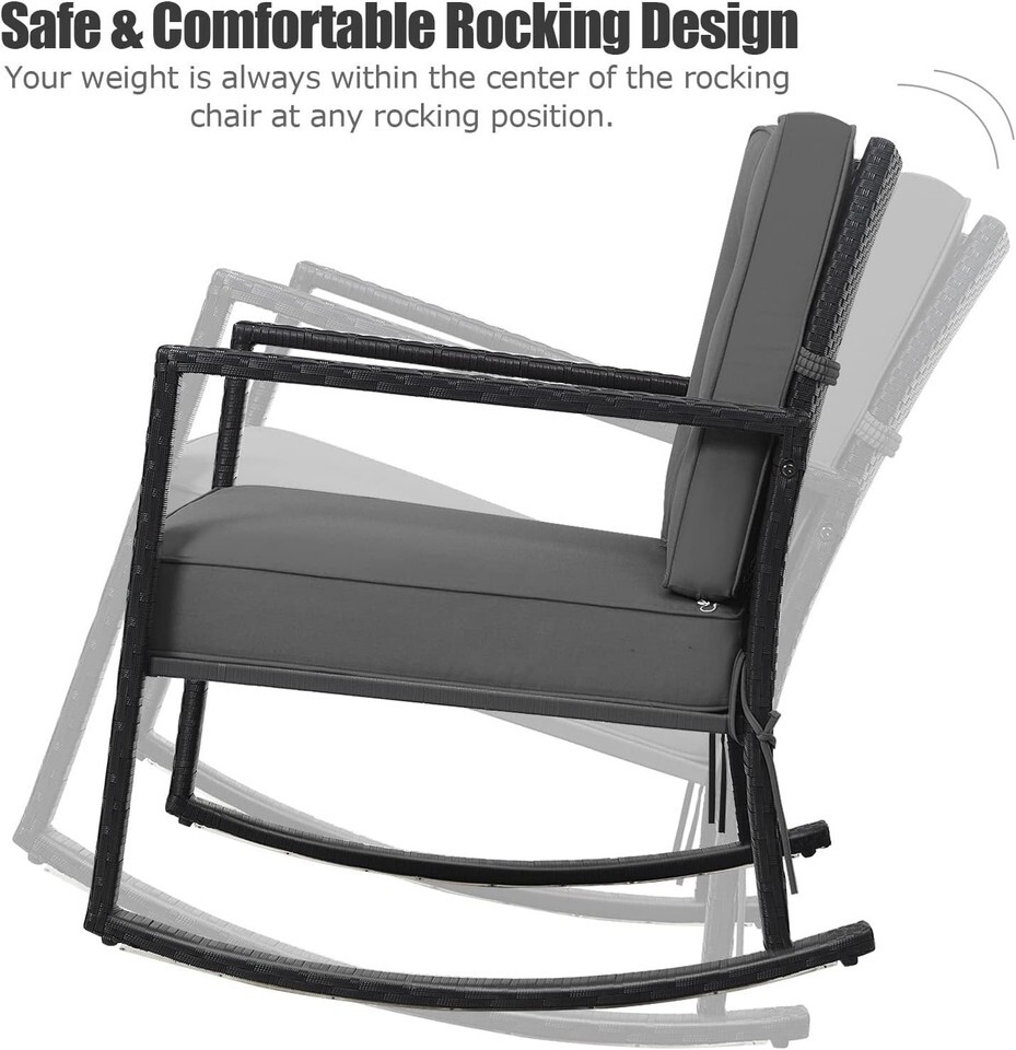 Outdoor Grey Wicker Rocking Chair with Cushions - Heavy Duty Steel Frame, Rus...