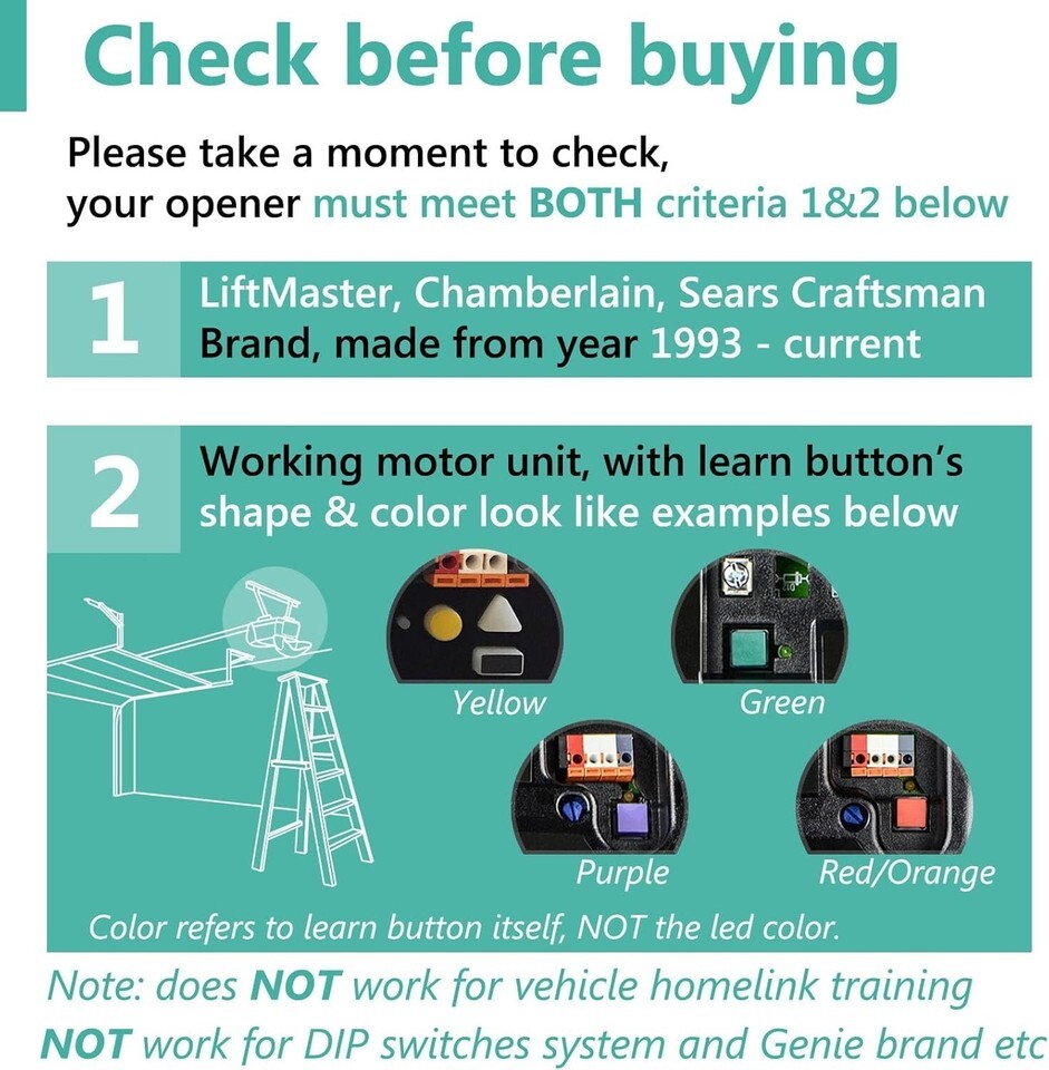 Compatible with openers featuring Purple, Red/Orange, Yellow, or Green smart/learn buttons.