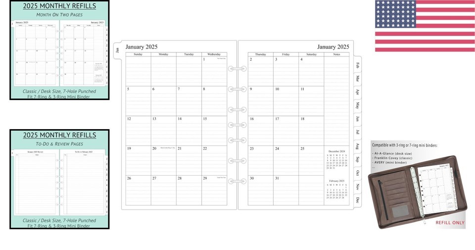 Coated Tab Monthly Planner Refills for 3-Ring 7-Ring Binders ? 2025 Edition