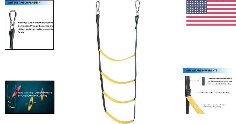 Navigating your way back on board has never been easier or safer! Our 4-Step Reflective Rope Ladder offers the perfect blend of durability and lightweight design tailored for adventure-seekers like you. With reinforced construction, stainless steel connections, and attention to safety details like non-slip steps and reflective rope, this ladder is your ultimate companion for excursions on the water.