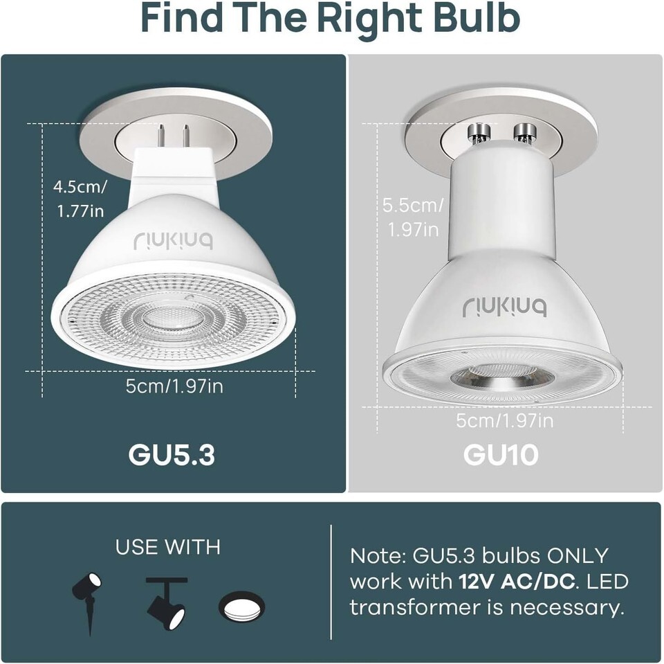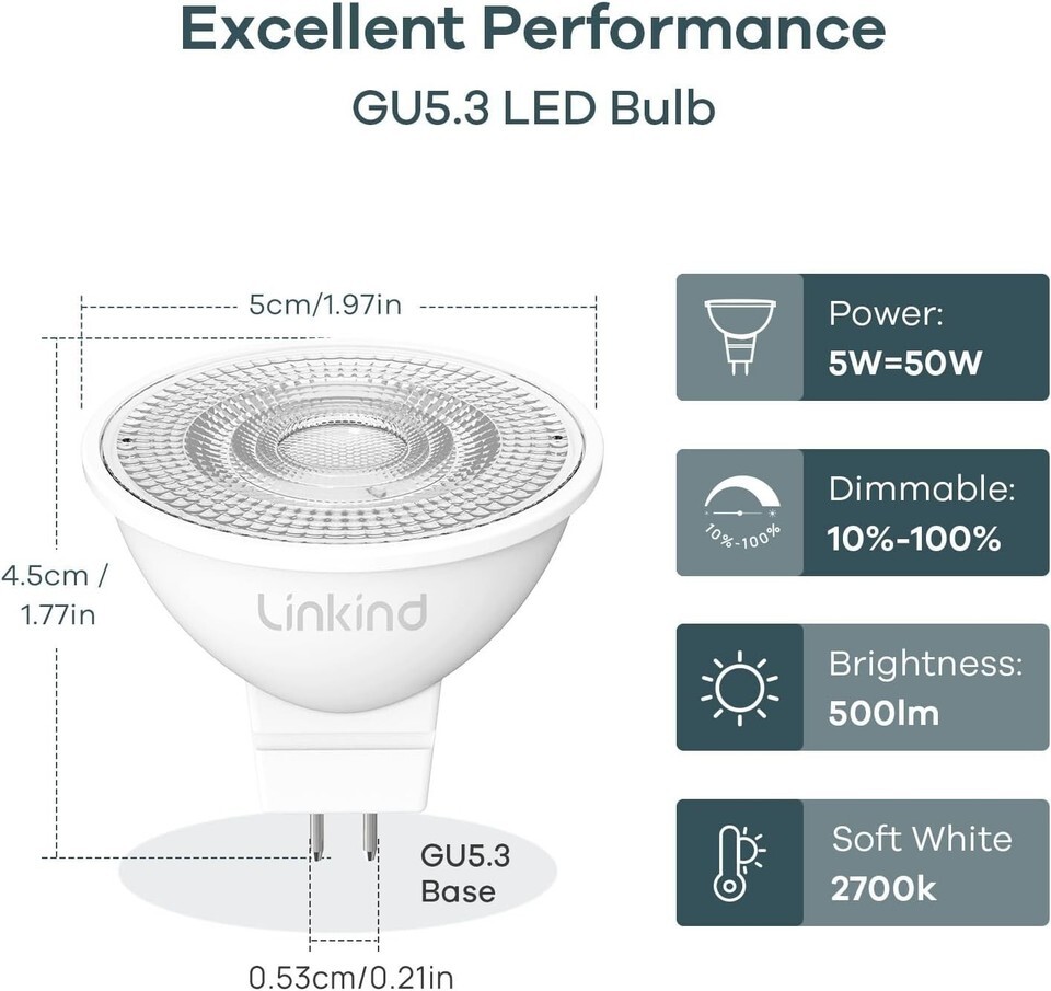 Ideal Dimensions: Standard shape measuring 1.97 x 1.77 inches with a GU5.3 bi-pin bulb base, seamlessly replacing traditional 1.97-inch halogen bulbs.