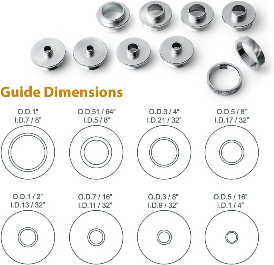8 Guide Bushings: 5/16", 3/8", 7/16", 1/2", 5/8", 51/64", 3/4", and 1".