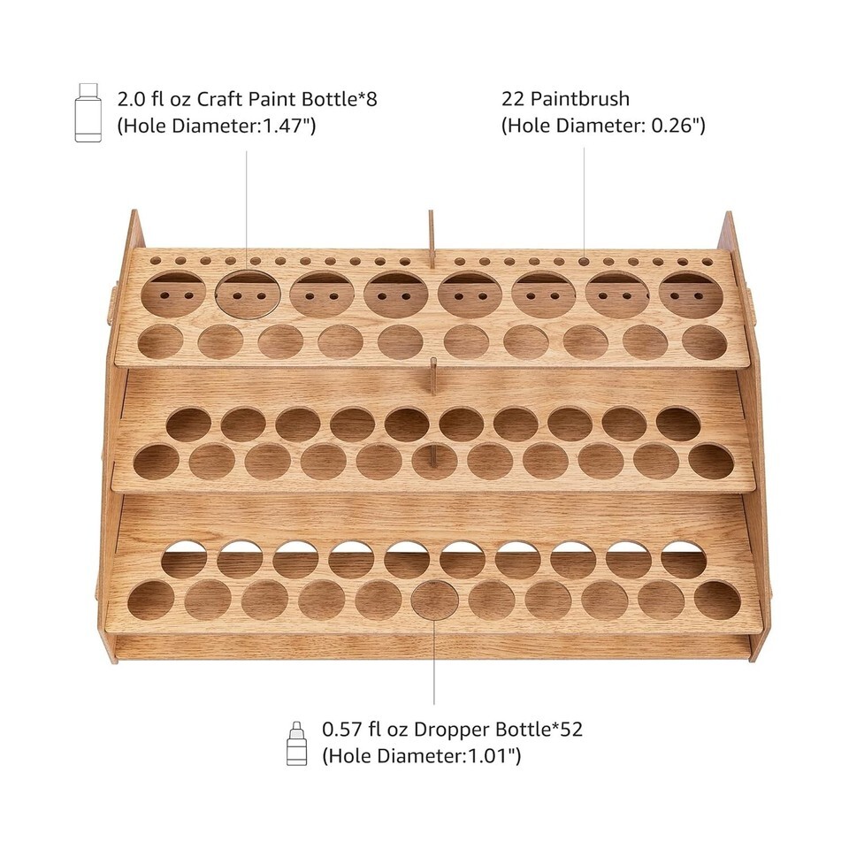 Spacious Storage: Designed to perfectly house up to 60 bottles of paint, accommodating 52 standard 1-inch diameter bottles or dropper bottles, as well as 8 larger 1.47-inch diameter bottles. Plus, it stores up to 22 paint brushes with a maximum barrel thickness of 0.5 inches.
