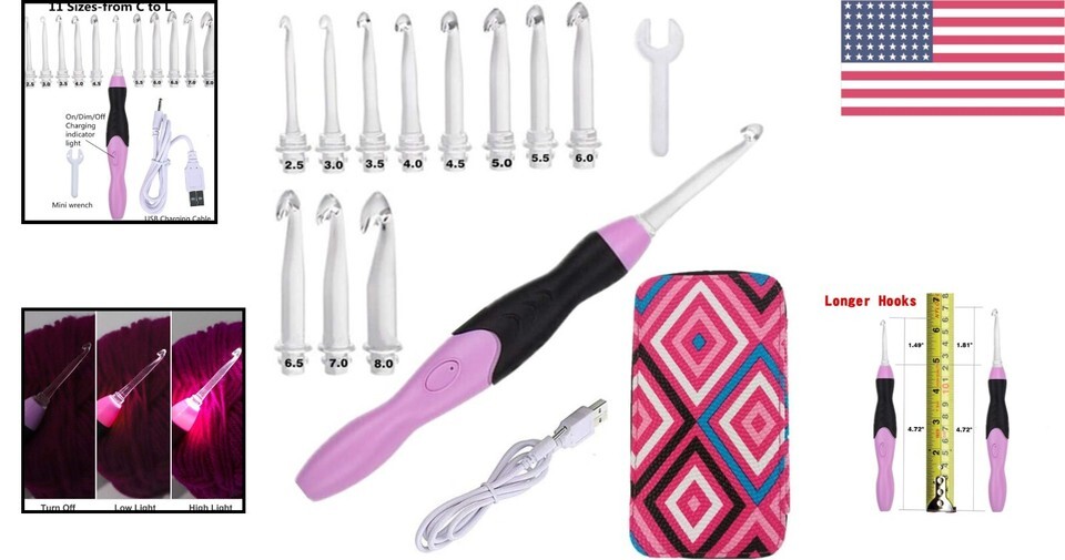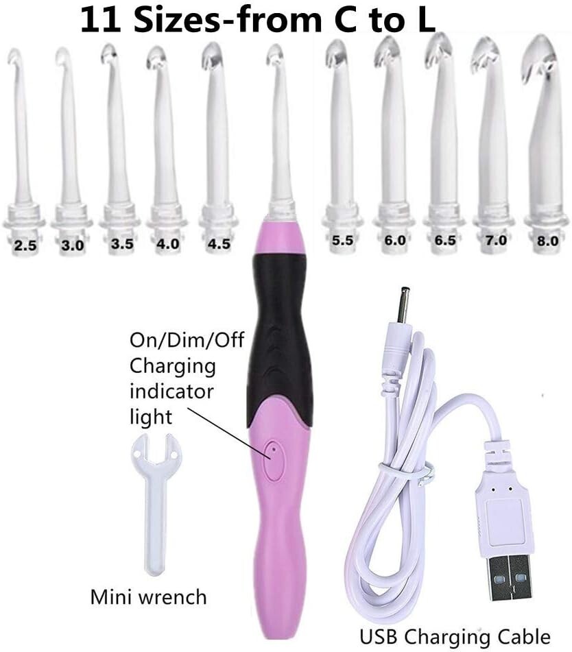 Rechargeable Lighted Crochet Hooks - 11 Interchangeable Sizes with Travel Case
