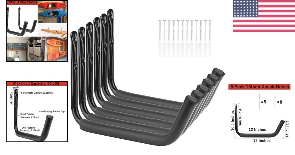 Rust-Resistant Kayak and Canoe Rack - Heavy-Duty 6 Hook Wall Organizer