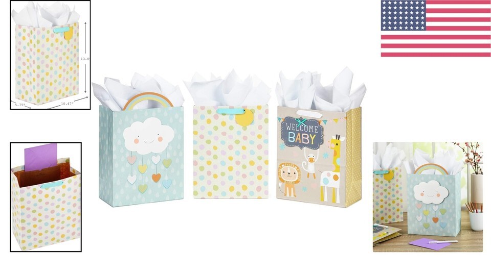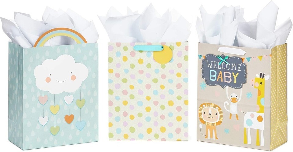 Adorable 3-Pack of Large Gift Bags for Baby Showers - Includes Tissue Paper
