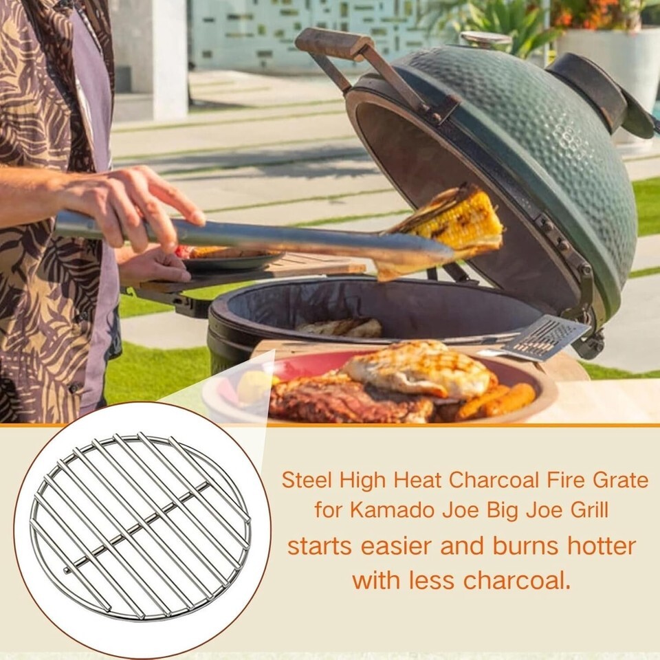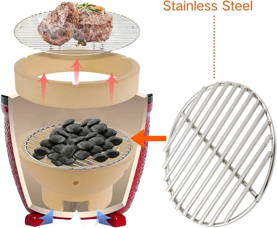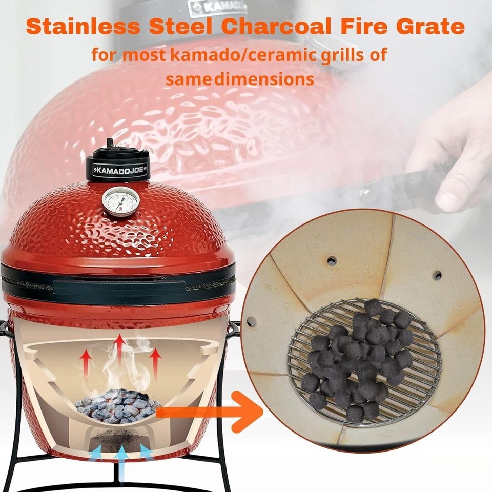 Features: Easy Clean,Rust Resistant,Superior Heat Retention,Stainless steel construction,Long lasting,Retains heat,Delivers professional searing,Prevents sticking,More airflow,Starts easier,Doesn't clog with ash and charcoal,Fits for most kamado/ceramic grills