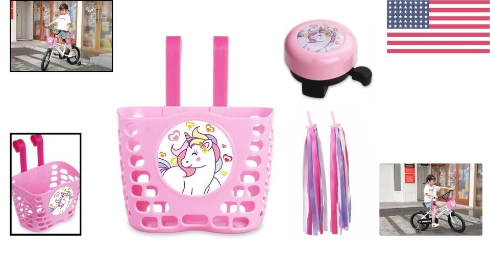 Charming Pink Unicorn Bike Basket Set with Bell Streamers for Kids' Bicycles