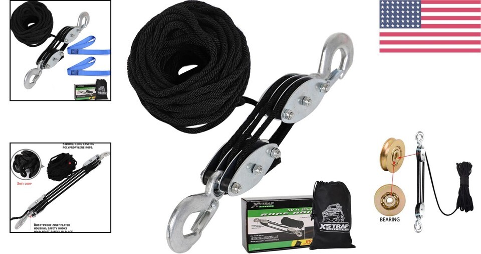 Whether you're a seasoned sportsman or a weekend warrior, our Premium 50 FT Heavy-Duty Pulley System simplifies heavy lifting tasks like never before. With its incredible strength, ease of use, and durable construction, you can tackle any challenge that comes your way. Perfect for lifting items in the garage, hoisting deer, or pulling heavy loads for various projects ? this pulley system is a game changer.
