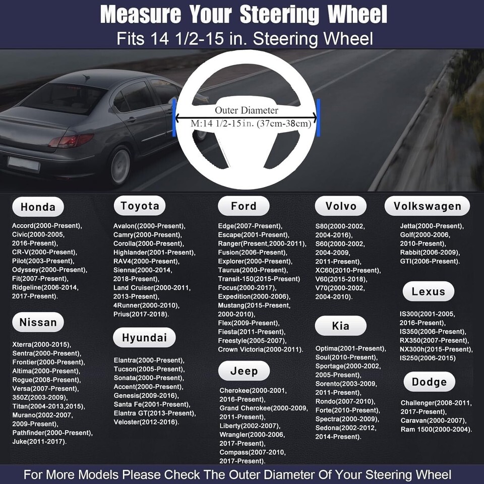 Designed to fit medium-sized steering wheels with a diameter of 14.5 to 15 inches (37 cm to 38 cm).