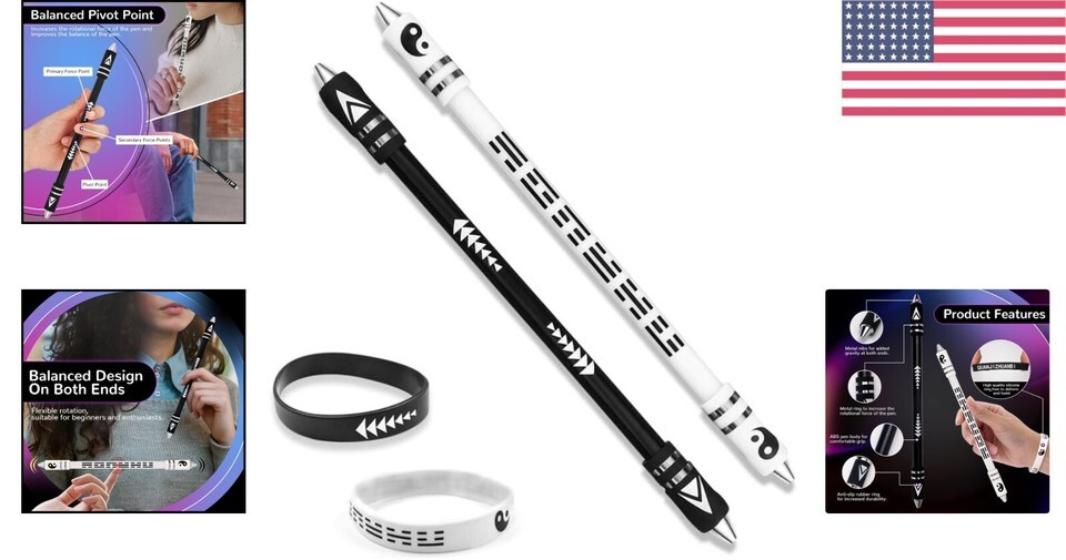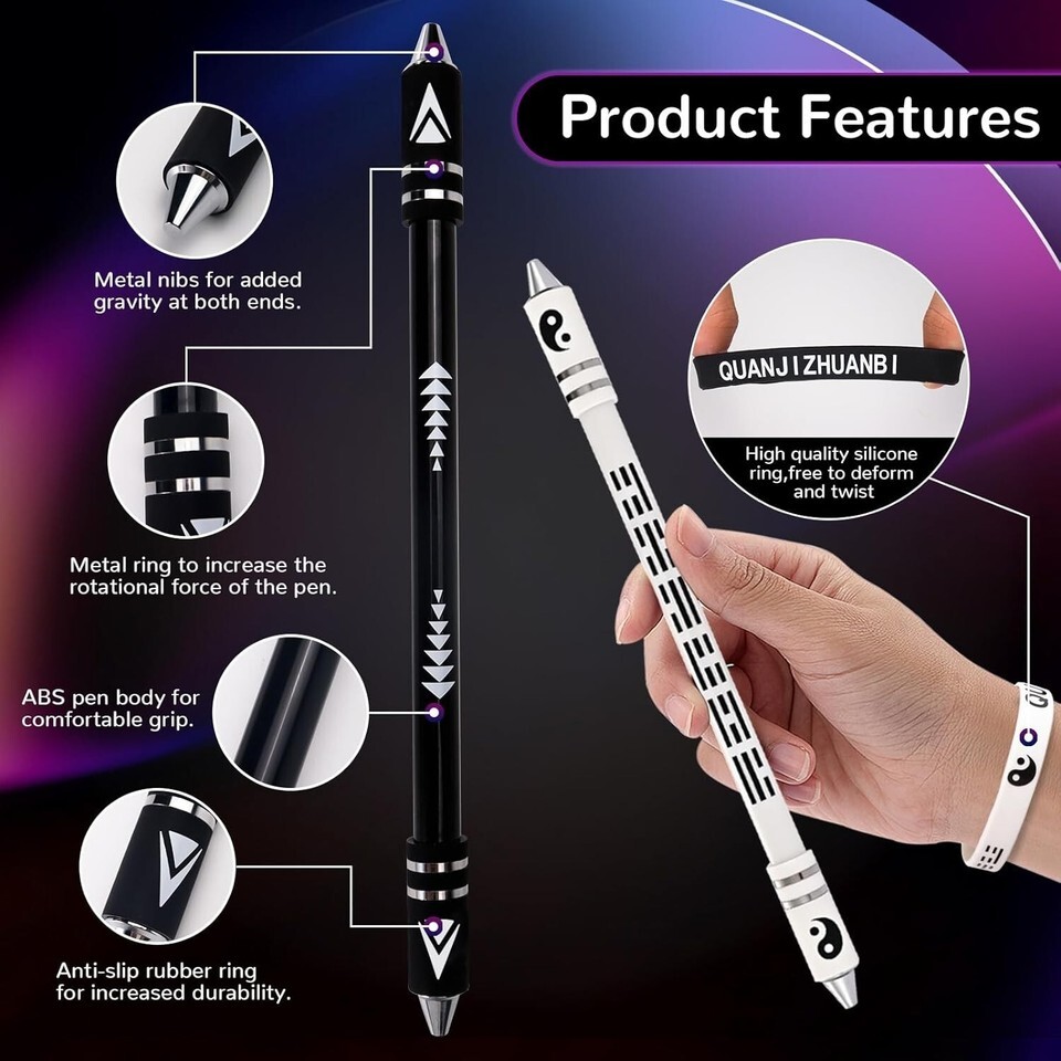Features: Pen Spinning,Weighted Ends,Non-Slip Grip,Durable,Shatter-Proof,Comfortable Hold,Twist Closure,2 Colors,Gaming Finger Pen,Silicone Bracelet,8.5 Inch Length,Beginner Friendly,High Stability,Increased Rotation Power,Wear-Resistant Coating,Finger Flexibility Enhancement,Coordination Exercise,Brain Power Improvement,Stress Reliever,Interesting Gift