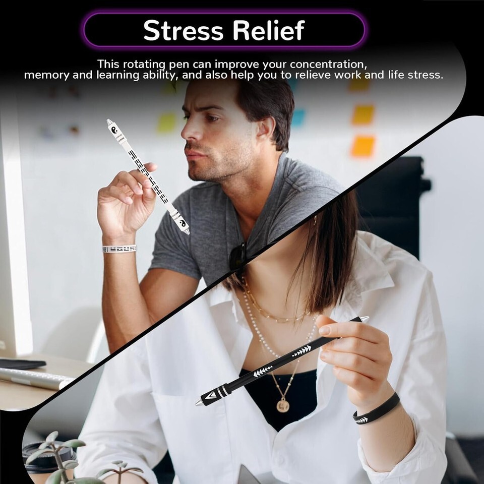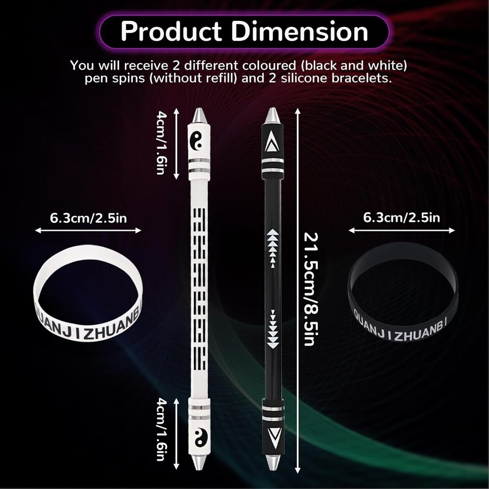 Package and Size: Two elegantly designed spinner pens in contrasting colors (without pen refill) and two stylish silicone bracelets.