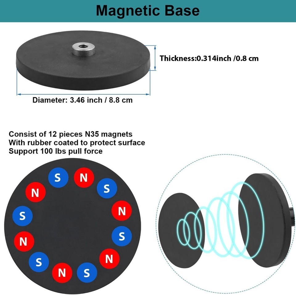 Magnetic Base: Consists of 12 powerful N35 magnets with a diameter of 3.46 inches (8.8 cm), ensuring a firm hold on iron, steel, nickel, and other magnetic surfaces. Supports horizontal tension up to 100 pounds and vertical suction of 88 pounds.