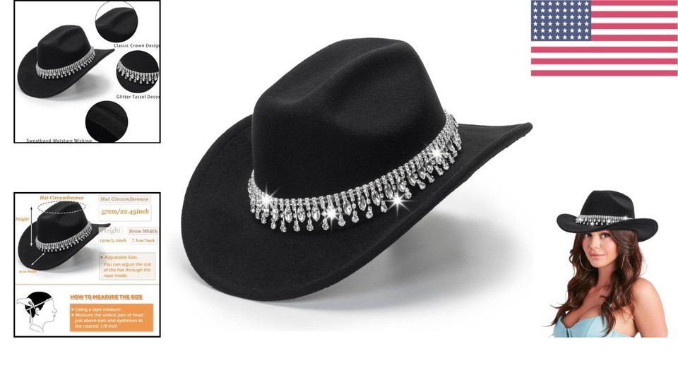 Dare to be different; order your Unique Adjustable Black Glitter Western Hat today, and let your personality shine like the rhinestones adorning your head!