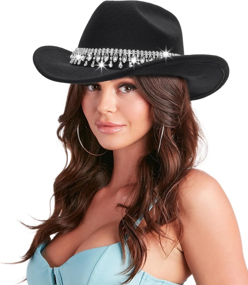Unique Adjustable Black Glitter Western Hat with Rhinestone Trim for Ladies