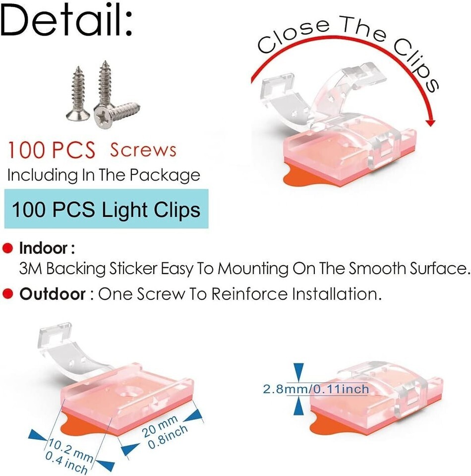 Transform your lighting capabilities with these clear self-adhesive clips featuring both adhesive and screw-in options. Not only do they hold your strip lights securely in place, but they also prevent clutter and ensure your space remains elegant and organized. With 100 clips and screws, you can tackle multiple projects with ease, knowing you have the quality and reliability behind every installation.