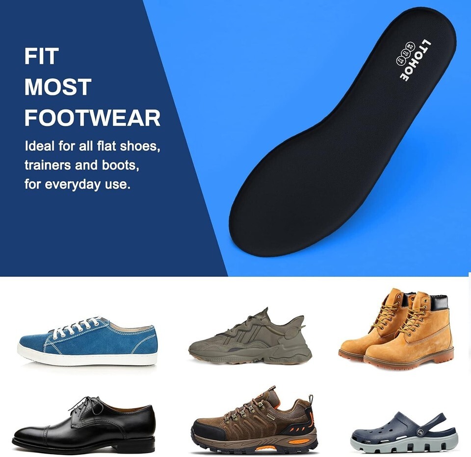 Enhances comfort in a variety of footwear: trainers, work shoes, walking boots, casual styles, loafers, and slippers.
