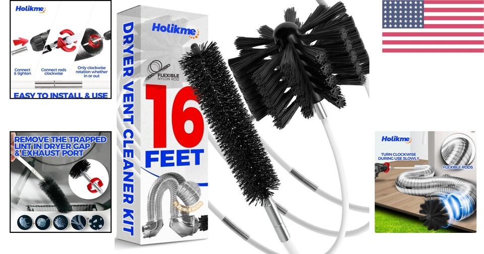 16 Feet Dryer Vent Cleaning Kit: Synthetic Brush & Drill-Compatible Lint Remover