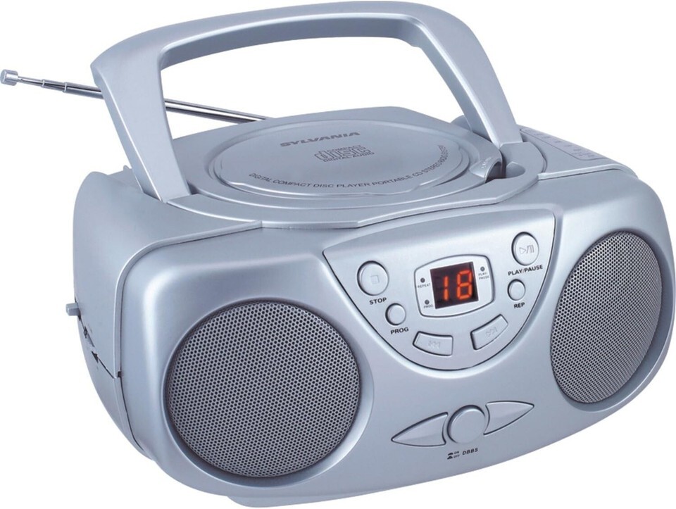 Portable CD Boombox with a sleek silver finish that complements any setting.