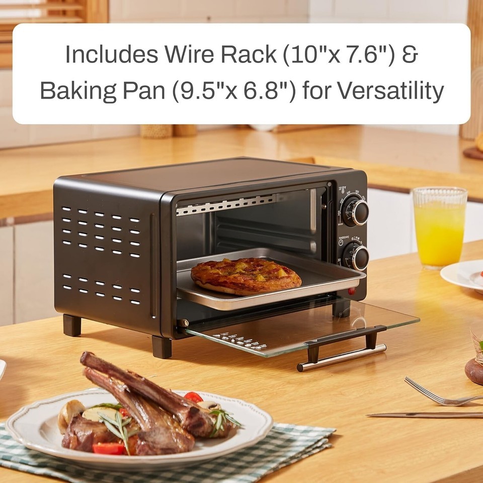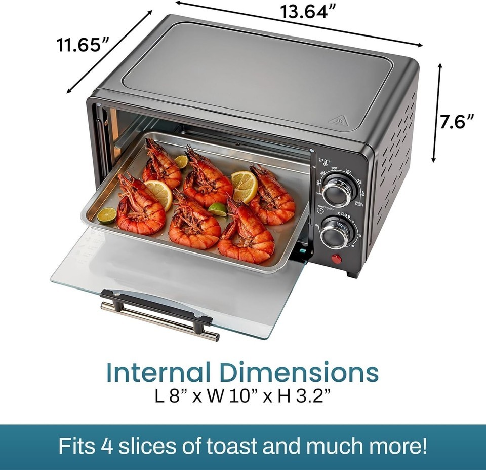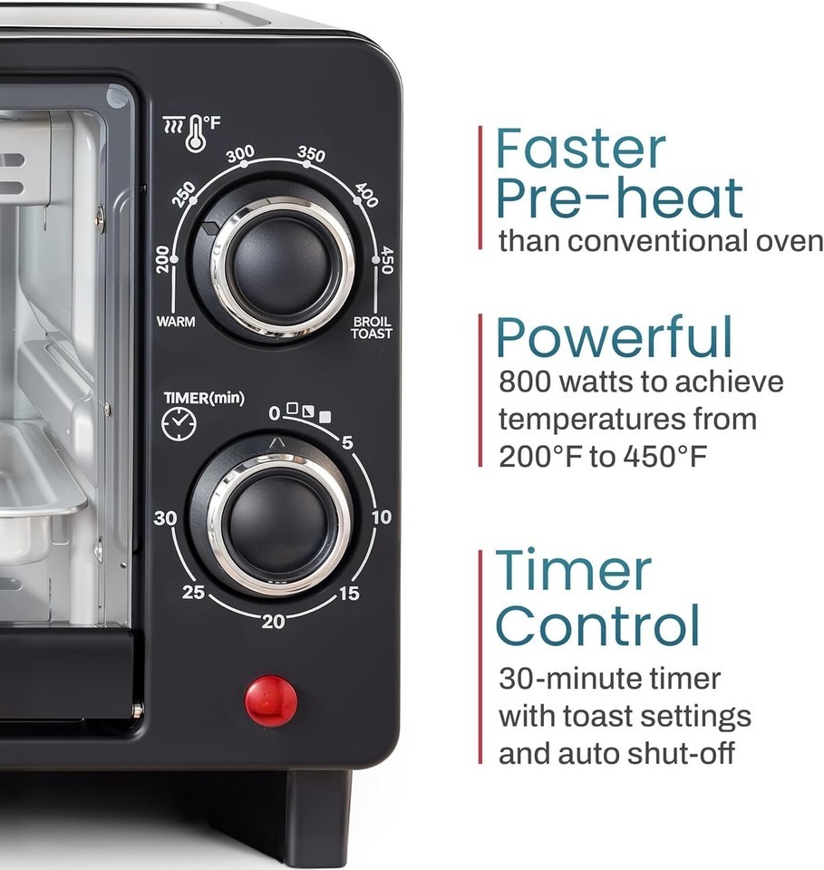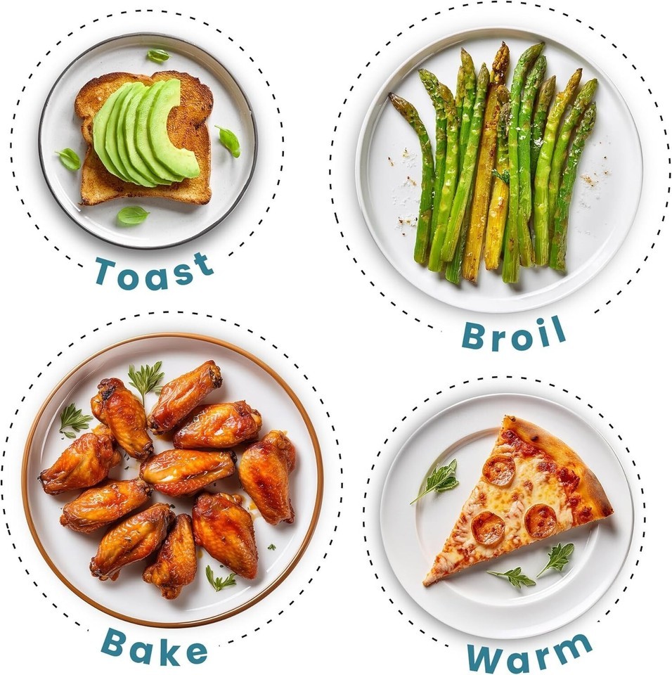 Adjustable Temperature Control: Easily adjust the oven controls from 200F to 450F, providing versatility for toasting, baking, roasting, or warming.