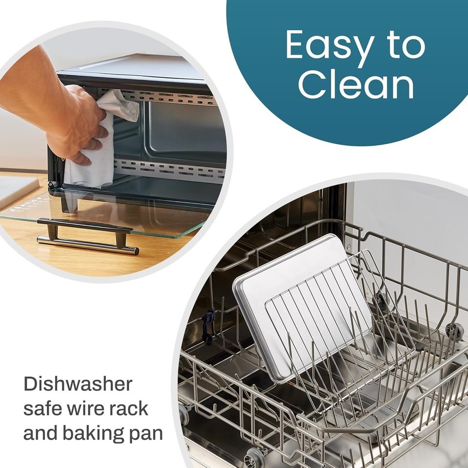 Included Accessories: Comes with an easy-to-clean baking pan and a wire rack that smoothly slides in and out of two rack positions to accommodate a range of foods.