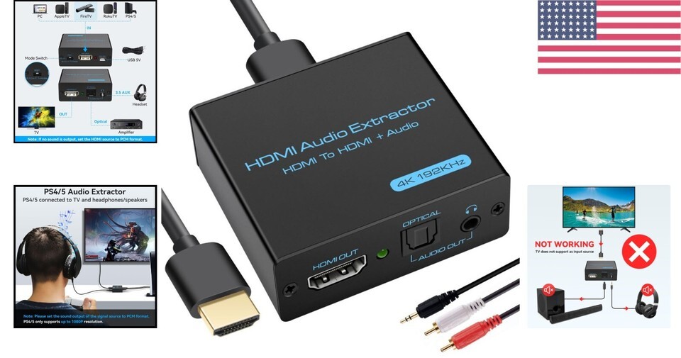 HDMI Audio Extractor: Efficiently extracts audio from HDMI signals and transmits it to AV receivers through optical or 3.5mm cable.