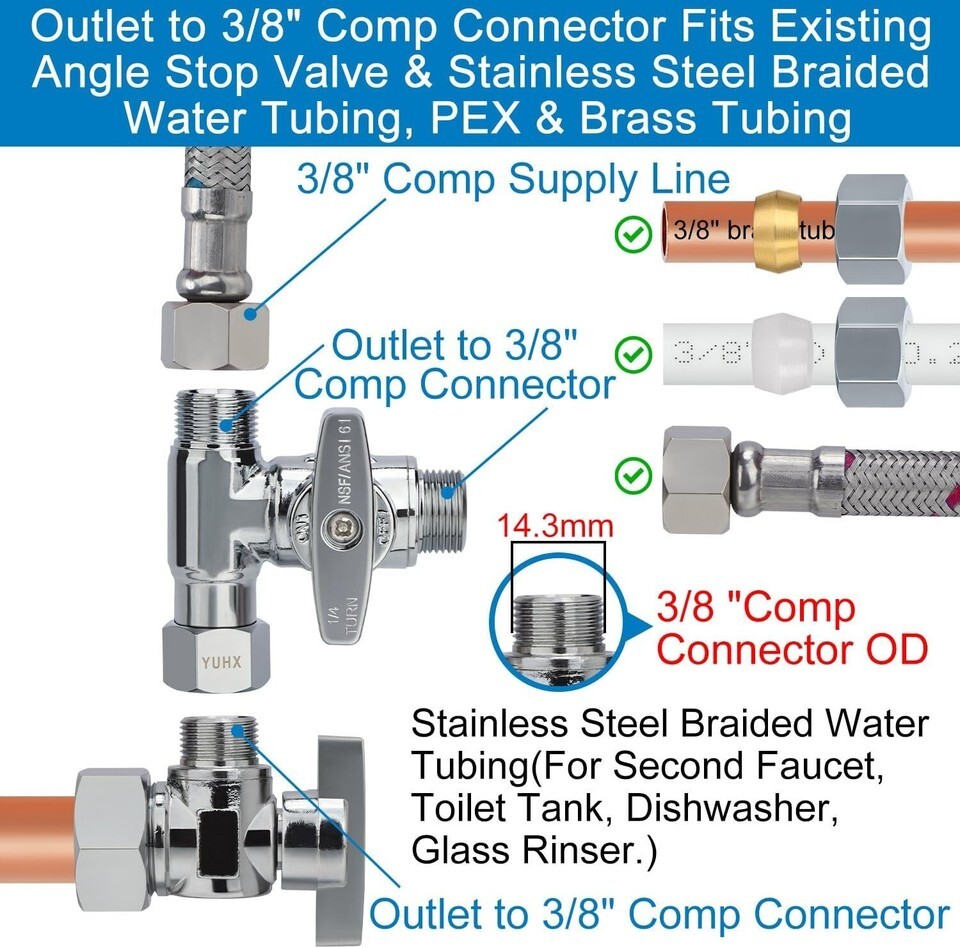 Package Includes: 1x 3/8" OD female compression x 3/8" OD compression x 3/8" OD compression angle stop Add-A-Tee valve; 1x 3/8" OD female compression thread to 1/2 NPT adapter.