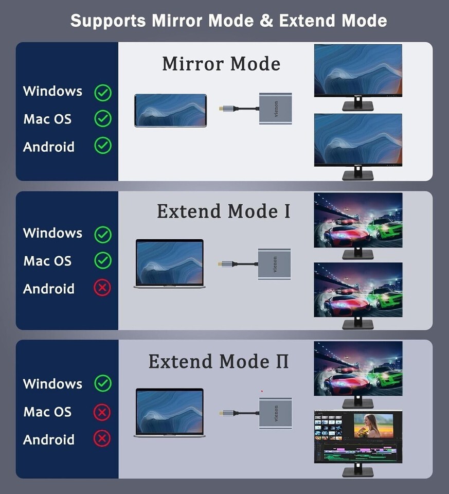Flexible Display Modes: Choose between Mirror Mode and Extend Mode on Windows, while Mac OS offers Mirror Mode only due to system limitations.