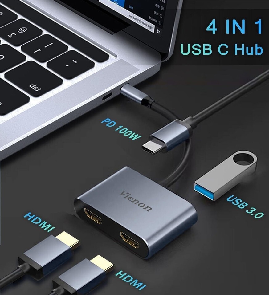 Dual HDMI Adapter 4K@60Hz USB C Hub with 100W PD - Ideal for Dual Monitor Setups