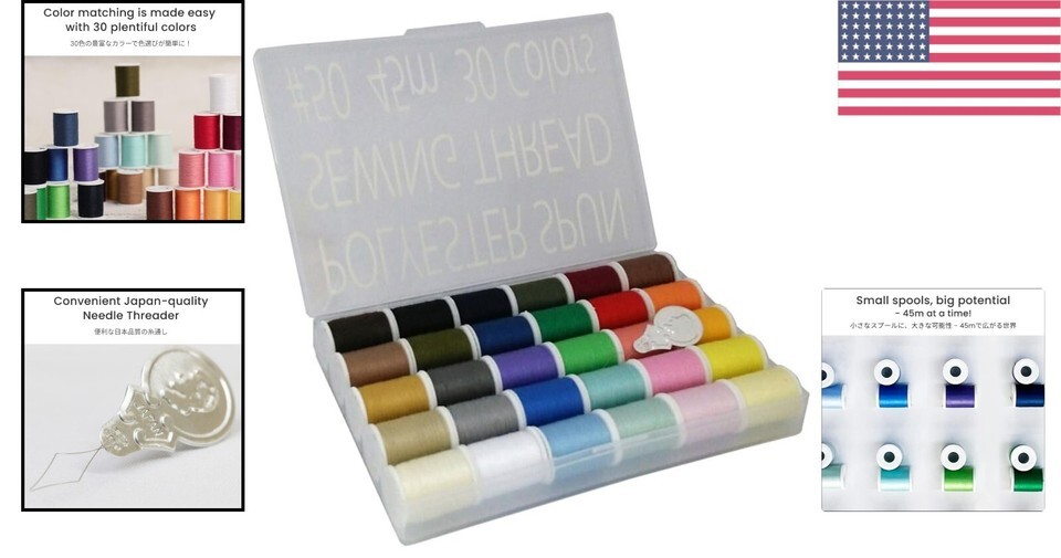Compact 30-Color Sewing Thread Kit with Quality Needle Threader - 45m Spools