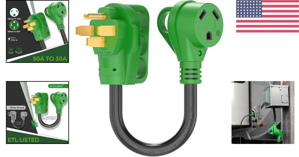 Features a 50A (NEMA 14-50P) male to 30A (NEMA TT-30R) female adapter cord.