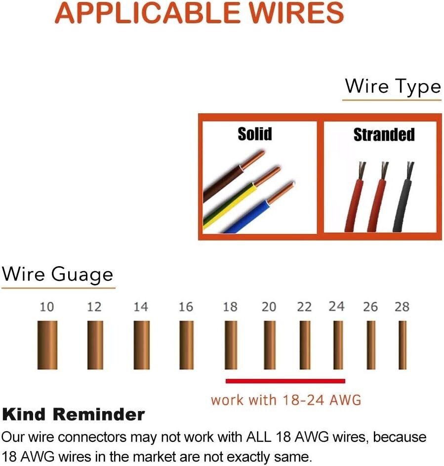 Flexible compatibility with stranded and solid core wires, safe for various wiring setups.