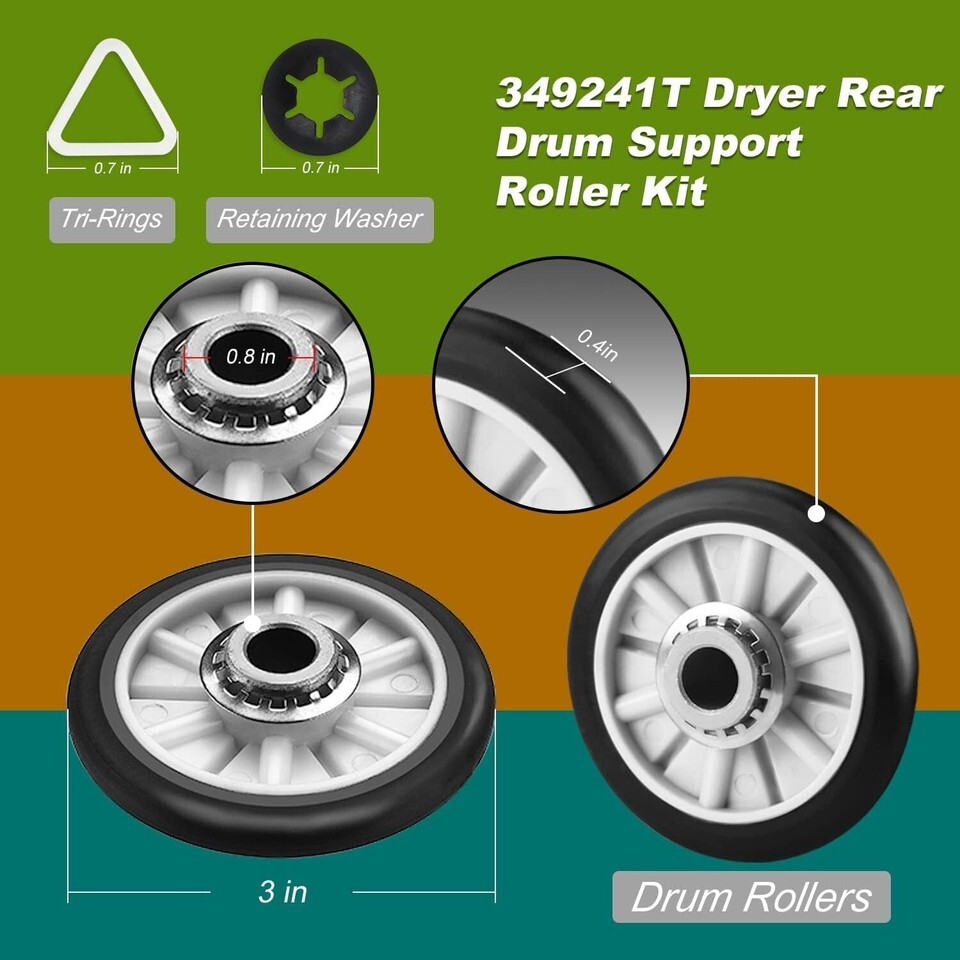 2 PCS 349241T Dryer Rear Drum Support Roller Kit: This includes 4 tri-rings and 1 retaining washer, ensuring your dryer drum is well-supported and functions smoothly.